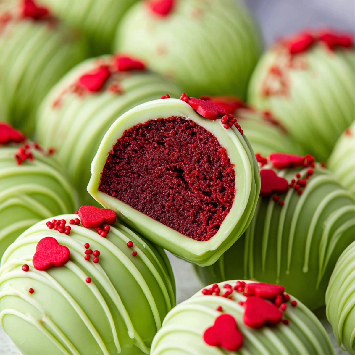 These festive no-bake treats are everything you want during the holidays without turning on your oven. They're sweet, creamy, and covered in that gorgeous light green candy coating that screams Christmas cheer. Plus, topping them with tiny red candy hearts? It's like the Grinch's heart grew three sizes, right there on your dessert plate.